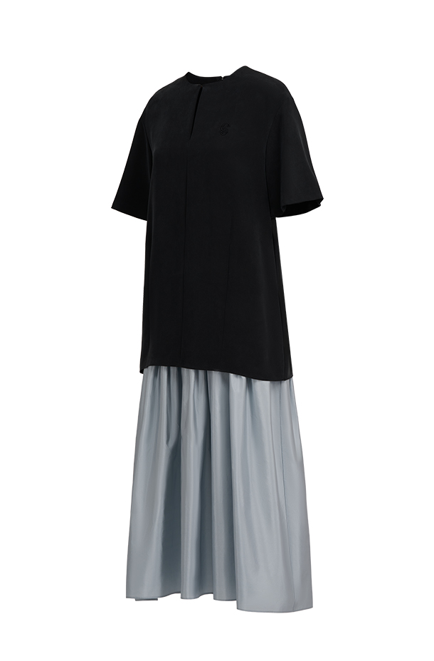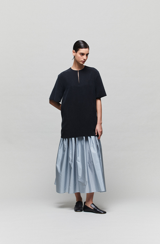 长裙袅袅,是营造慵懒浪漫气质必不可少的单品· 黑与蓝撞色,慵懒率性的T恤与柔美碎褶长裙结合· 领口迷你挂钩可以闭合,也可以打开成为小V领型· 适合多种场合,通勤、休闲、派对皆可让穿着者于从容自在的状态中展现真实自我