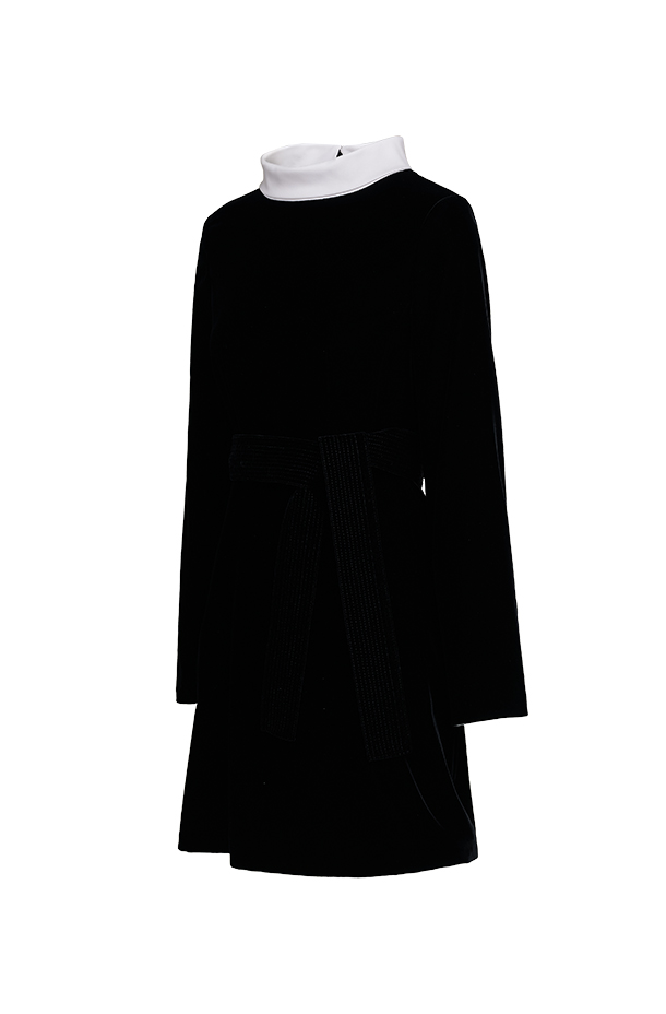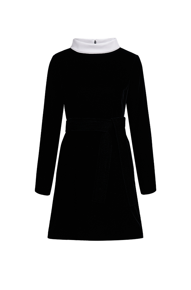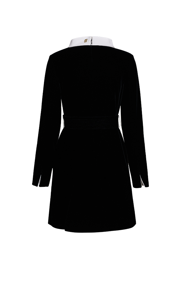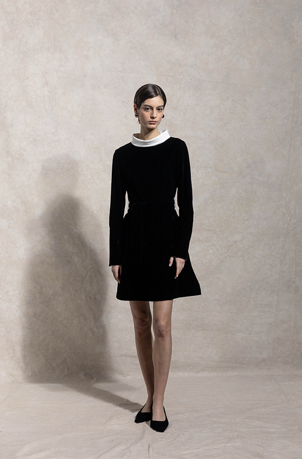 CURIEL经典赫本裙型,修身剪裁勾勒优雅身形,复刻50年代廓形。新型环保天鹅绒,柔软细腻,光泽优雅。黑白撞色领身设计,绗缝腰带勾勒曼妙曲线,展现复古女性魅力。修长袖型搭配丝绒质感,袖口内衬可翻折,兼具温暖与仪式感。面料A:粘纤66% 铜氨纤维32% 氨纶2%面料B:棉50% 锦纶47% 氨纶3%里料A:桑蚕丝91% 氨纶9%里料B:桑蚕丝100%