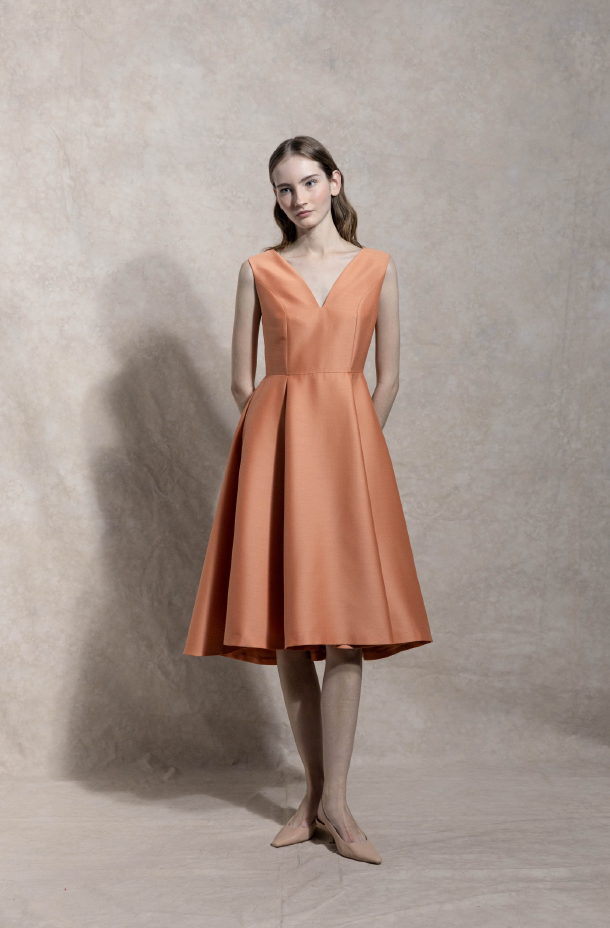 典藏系列经典廓形,灵感源于品牌档案。丝绸光泽与羊毛温暖交融,呈现多角度高级质感。深V心形领与裙摆,尽显意式曲线剪裁的精湛工艺。高级工艺打造,彰显晚礼服的精致与典雅。面料:绵羊毛90% 桑蚕丝10%里料:铜氨纤维100%