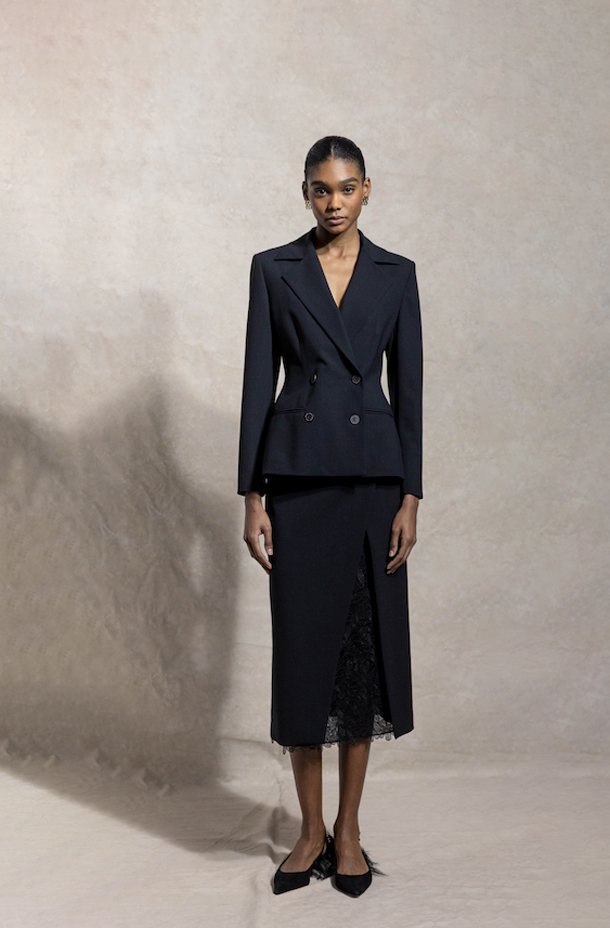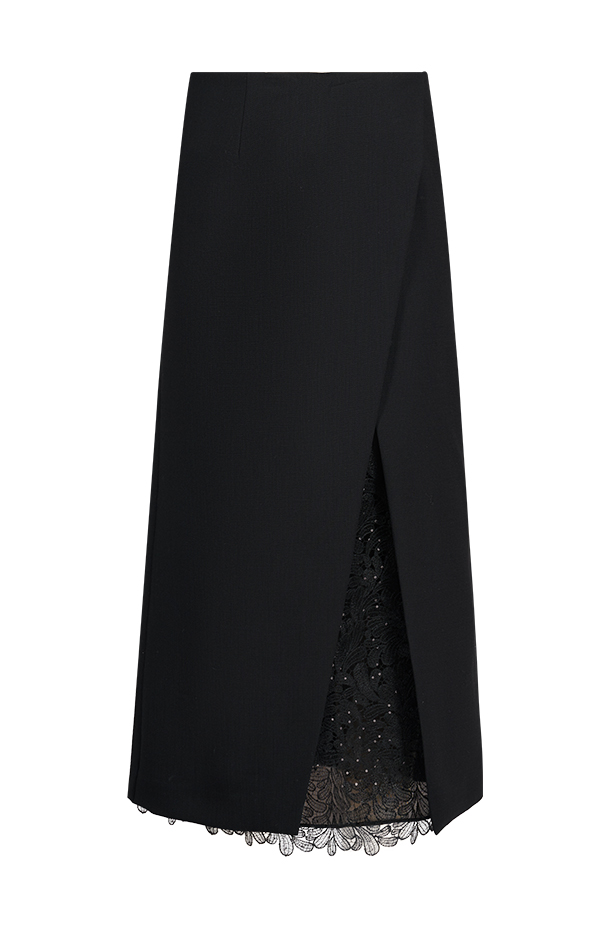 经典黑色长款半裙,低调高级。开衩处精致蕾丝内里,若隐若现增添柔美韵味。长款剪裁修饰腿部线条,行走间自然飘逸。面料A:绵羊毛95% 氨纶5%面料B:聚酯纤维68% 锦纶32%里料:桑蚕丝100%