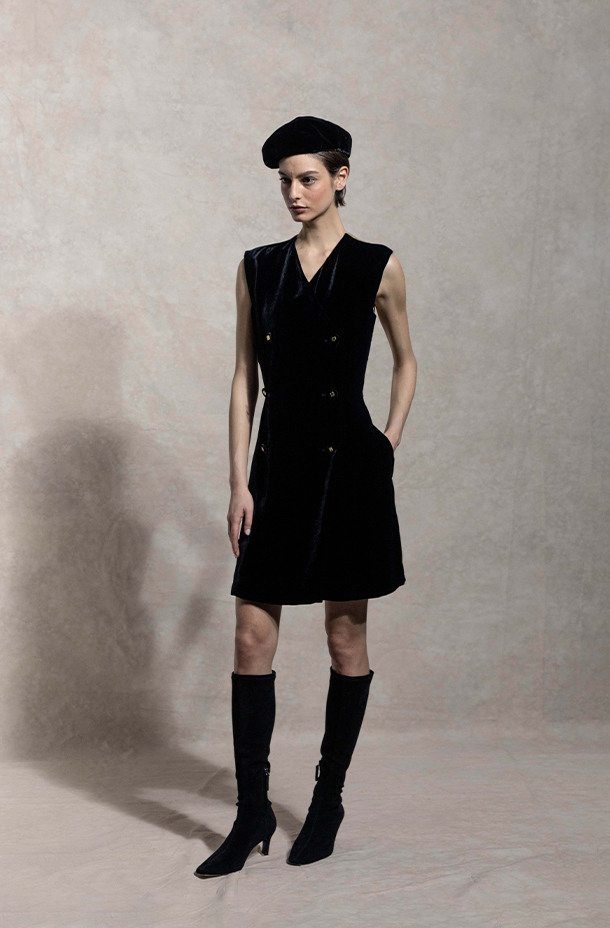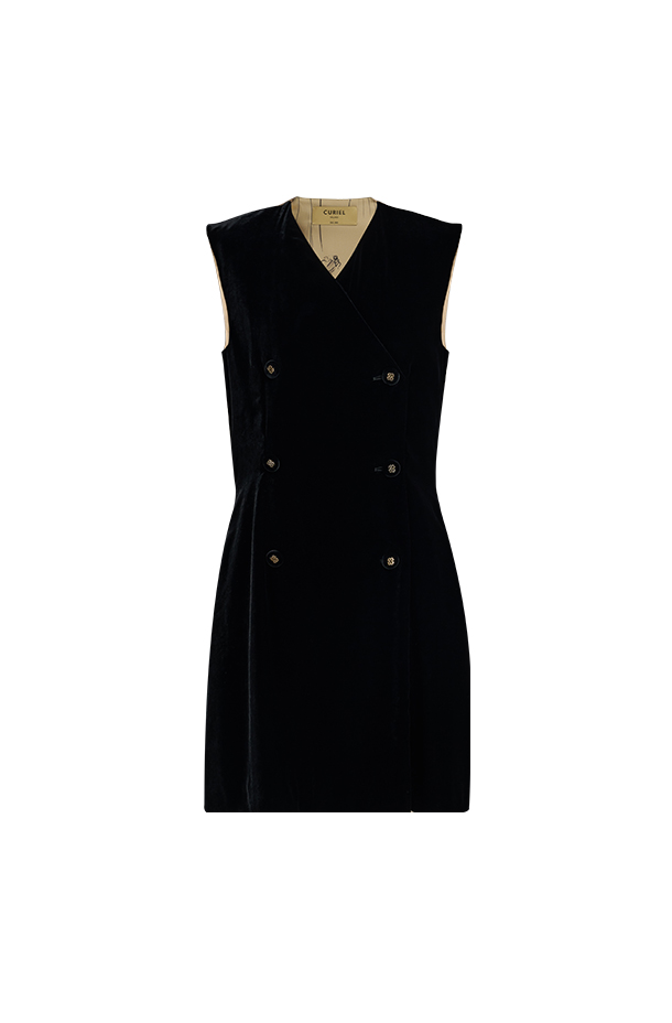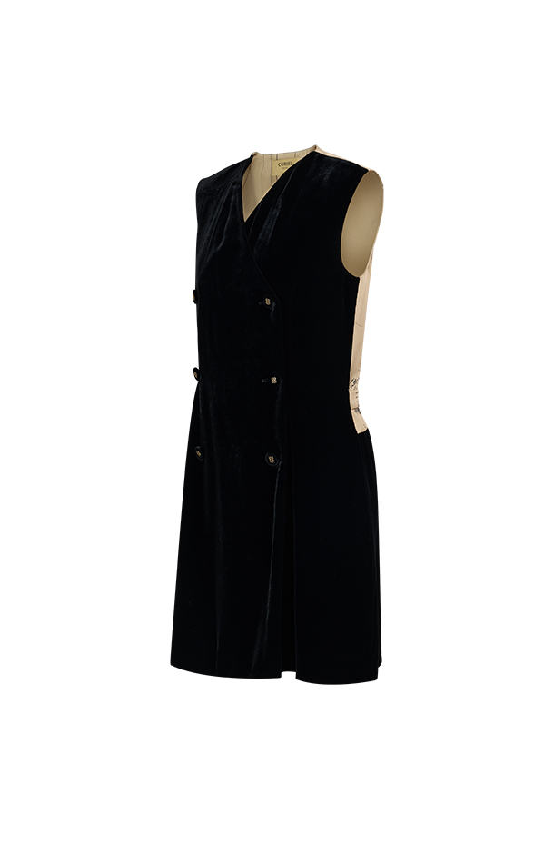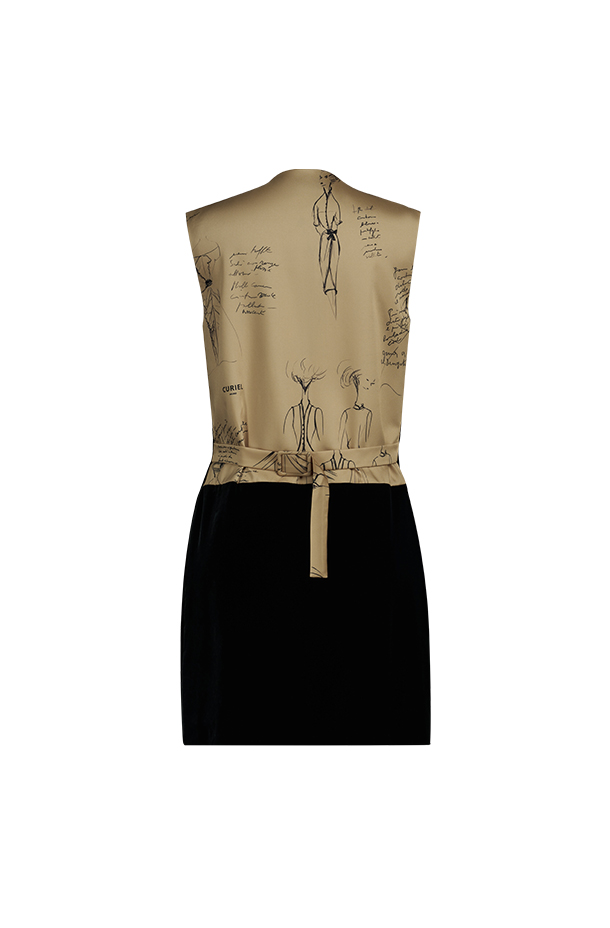前片与裙身采用CURIEL黑丝绒,低调奢华,彰显品牌魅力。后背金色印花面料,CURIEL archive手稿图案,传递品牌传承。腰部可调节金色腰带,自由塑造身形。双排丝绒扣搭配金色CURIEL logo,黑金配色,精致优雅。面料A:底布:铜氨纤维100% 绒纱:粘纤100%面料B:桑蚕丝100%
