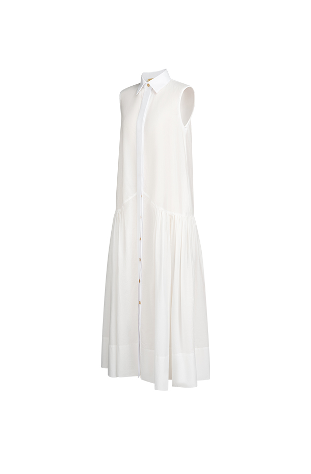 白色无袖设计,简约清新,适合春夏穿着。衬衫领口优雅正式,适应多场合。捏褶裙摆增添动感,凸显流畅线条与女性气质。柔软面料舒适,内附白色吊带,现代感十足。面料:外裙:棉71% 锦纶29%里料:内裙:桑蚕丝91% 氨纶9%