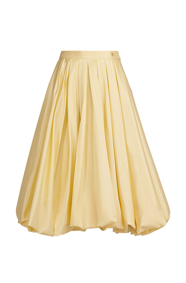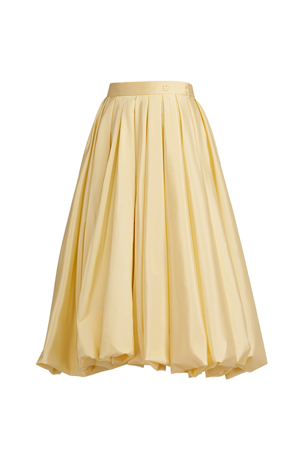 这款奶油黄色长款云朵裙以双层设计独具匠心,外层轻盈的面料覆盖在里层之上,巧妙地营造出梦幻的云朵效果· 高密度丝绸和涤纶塔夫塔混纺面料· 柔和的奶油黄色低调又日常,适合多种场合的穿着· 裙摆随着每一步轻盈摆动,宛如云朵般飘逸,令穿着者在任何场合都能自信而迷人