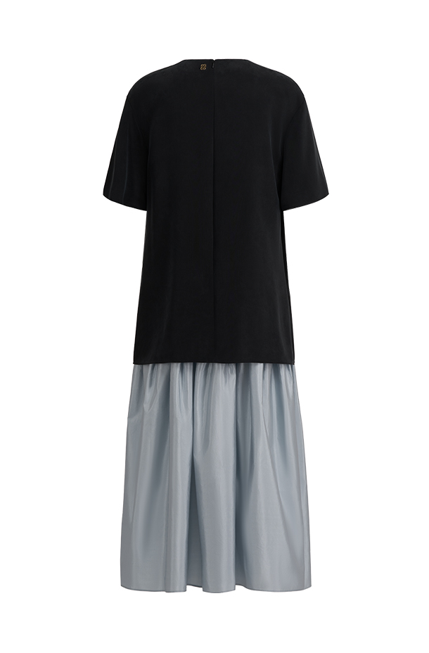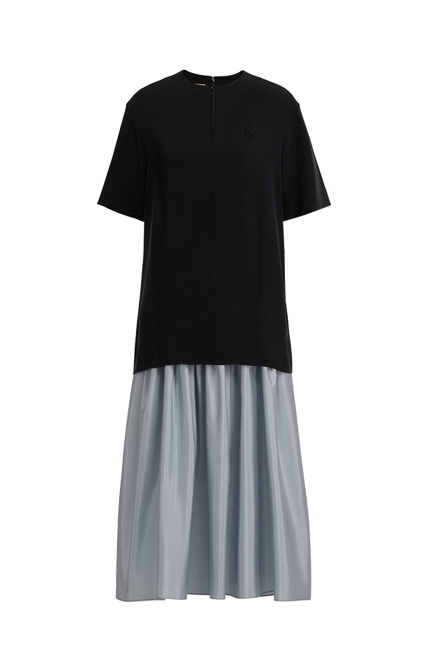 长裙袅袅,是营造慵懒浪漫气质必不可少的单品· 黑与蓝撞色,慵懒率性的T恤与柔美碎褶长裙结合· 领口迷你挂钩可以闭合,也可以打开成为小V领型· 适合多种场合,通勤、休闲、派对皆可让穿着者于从容自在的状态中展现真实自我