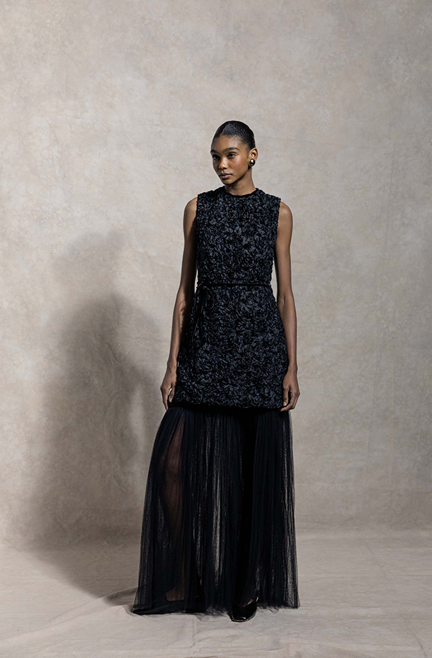 上半身黑色立体花卉面料,肌理丰富,立体奢华。下半身黑色真丝网纱,轻盈飘逸,步履灵动。领口丝绒收边,精致复古,提升质感。贴身剪裁与柔软材质结合,舒适服帖,尽显高贵浪漫。外裙A:聚酯纤维100%外裙B:锦纶100%外裙里料:醋纤65% 聚酯纤维35%内裙A:醋纤65% 聚酯纤维35%内裙B:桑蚕丝100%