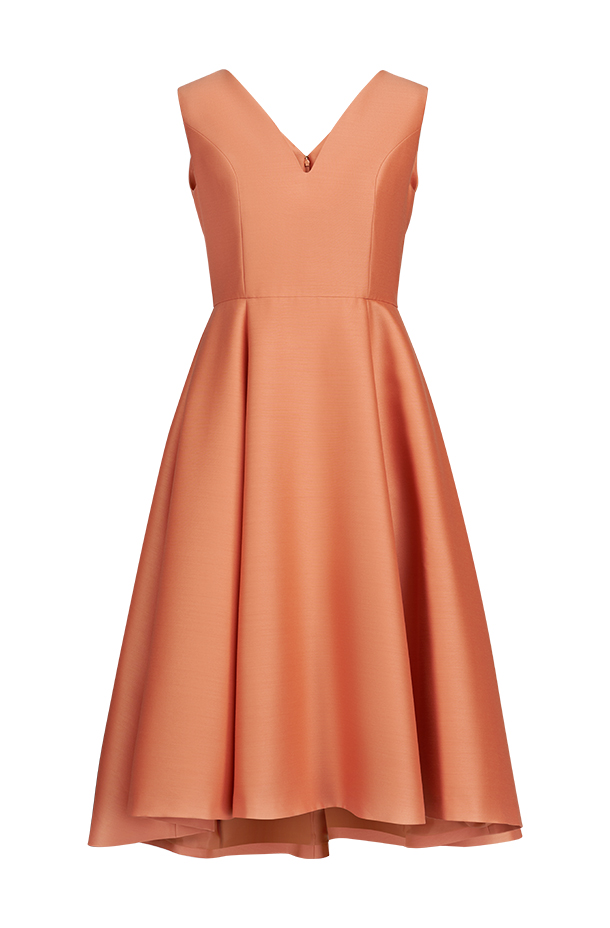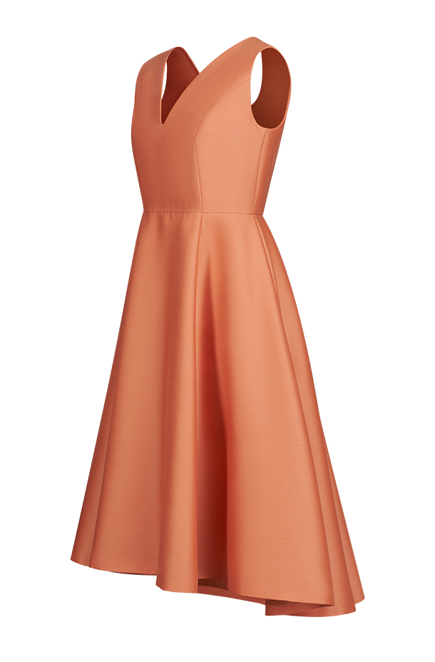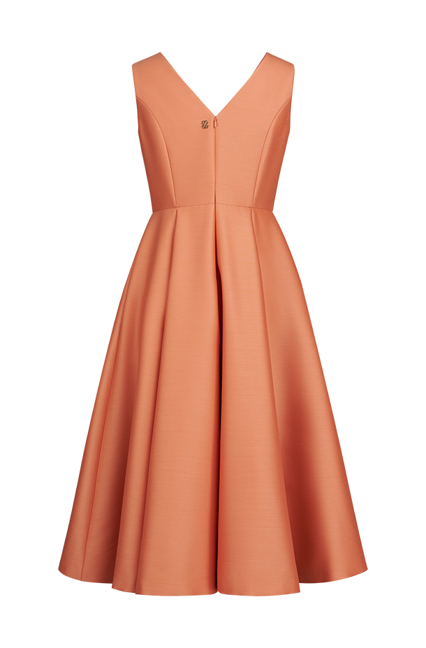典藏系列经典廓形,灵感源于品牌档案。丝绸光泽与羊毛温暖交融,呈现多角度高级质感。深V心形领与裙摆,尽显意式曲线剪裁的精湛工艺。高级工艺打造,彰显晚礼服的精致与典雅。面料:绵羊毛90% 桑蚕丝10%里料:铜氨纤维100%