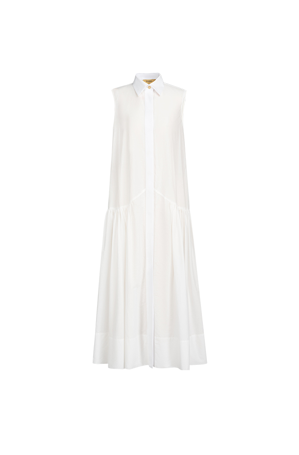 白色无袖设计,简约清新,适合春夏穿着。衬衫领口优雅正式,适应多场合。捏褶裙摆增添动感,凸显流畅线条与女性气质。柔软面料舒适,内附白色吊带,现代感十足。面料:外裙:棉71% 锦纶29%里料:内裙:桑蚕丝91% 氨纶9%