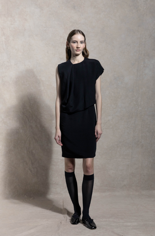 高档丝毛混纺微弹面料,轻盈柔软,奢华垂坠,自然勾勒身形。上半身无袖与小连肩袖对比设计,增添个性层次感。领口侧边捏褶,包容性佳,展现优雅线条。下半身包臀短裙剪裁得体,长度适中。面料:绵羊毛73% 桑蚕丝27%里料A:桑蚕丝100%里料B:桑蚕丝100%