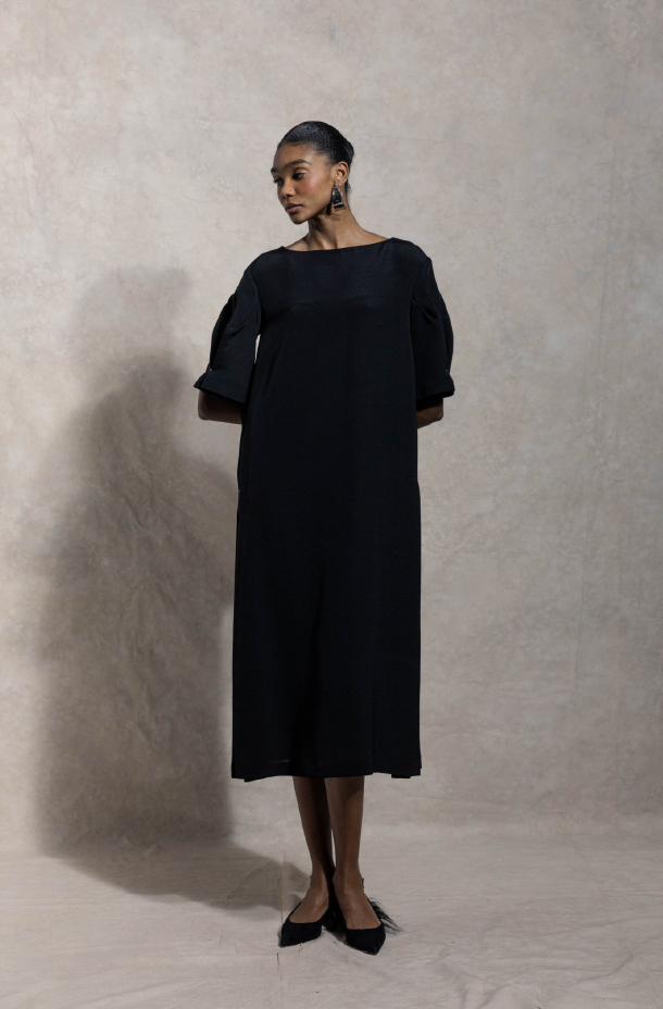 高档丝毛混纺面料,轻盈柔软,垂坠自然,勾勒优雅身形。袖口对褶配银线装饰,光影间闪烁精致动感。船领设计优雅包容,衬托肩部线条。宽松剪裁,兼具日常舒适与特殊场合风格。面料:绵羊毛73% 桑蚕丝27%