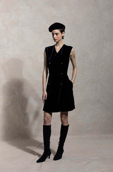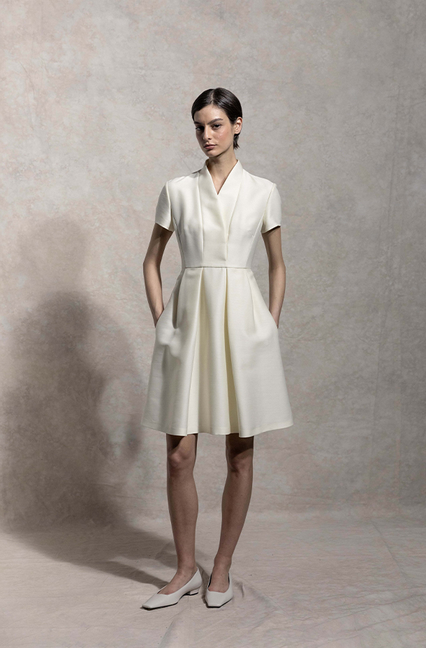 交叉V领勾勒颈部线条,精致优雅短袖剪裁,简洁干练兼具女性温婉生丝与羊毛交织,丝绸光泽与温暖质感兼具,高级感十足适合通勤或正式场合,经典百搭不可或缺面料:绵羊毛90% 桑蚕丝10%里料:桑蚕丝100%