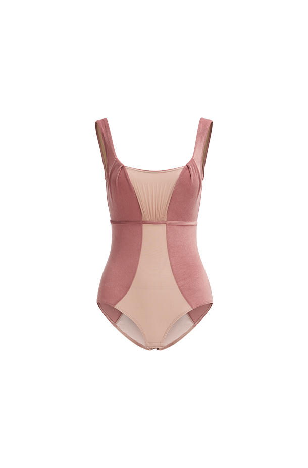 ② 裸色捏褶网纱拼接蔷薇色丝绒,搭配裸色弹力面料,巧妙展现女性曲线