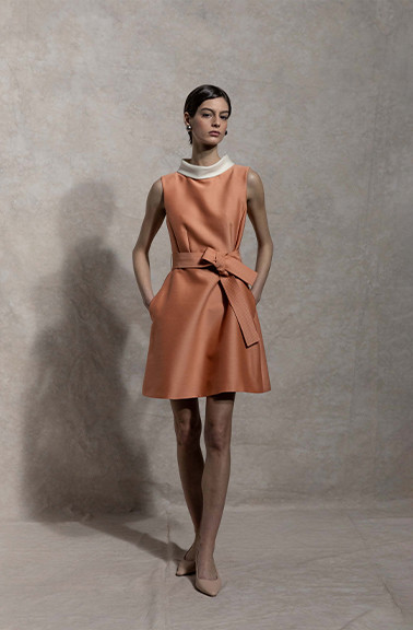 HEPBURN经典版型短款连衣裙,丝毛混纺材质,精致优雅。生丝与羊毛交织,丝绸光泽与羊毛温暖,多角度呈现高级质感。50年代经典裙型,意式弧线剪裁考究精致。翻边领立体有型,衬托颈部优美线条。面料:绵羊毛90% 桑蚕丝10%里料:铜氨纤维100%